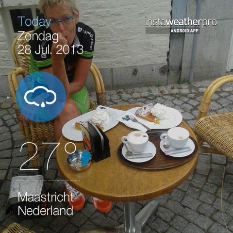 Goed geslapen. Half negen zaten we weer op de fiets, langs het kanaal richting Maastricht (en ja hoor tegenwind) daar waren we om elf uur lekker koffie met vlaai want Piet is jarig vandaag! ! Iedereen bedankt voor de felicitaties. Half twaalf zijn we aan de echte route begonnen. Super weggetjes, met behoorlijke klimmetjes dan is het warm en afzien maar als je eenmaal boven bent is het uitzicht de moeite waard. Helaas niet kunnen lunchen maar gelukkig hadden we nog eten en drinken genoeg. Toen we net ons eigen brood op hadden was er nog geen 100 meter verder een restaurantje. Dat zul je altijd zien. Verder richting Limbourg klimmen en dalen naar Jalhay, lekker koffie gedronken het boekje gaf aan dat daar ook een camping was maar die hebben we niet kunnen vinden, toen was het nog even doorbijten naar Spa daar waren we om half zes. Tentje opgezet Richardje gedaan lekker gedouched en nu gaan we zo uiteten om Piet zijn verjaardag te vieren. Totaal vandaag 102 km gefietst